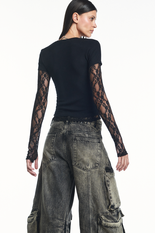 CAMISETA SOBREPOSIÇÃO MANGA RENDA PRETA