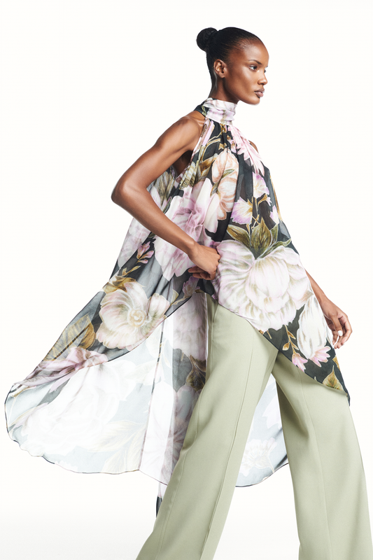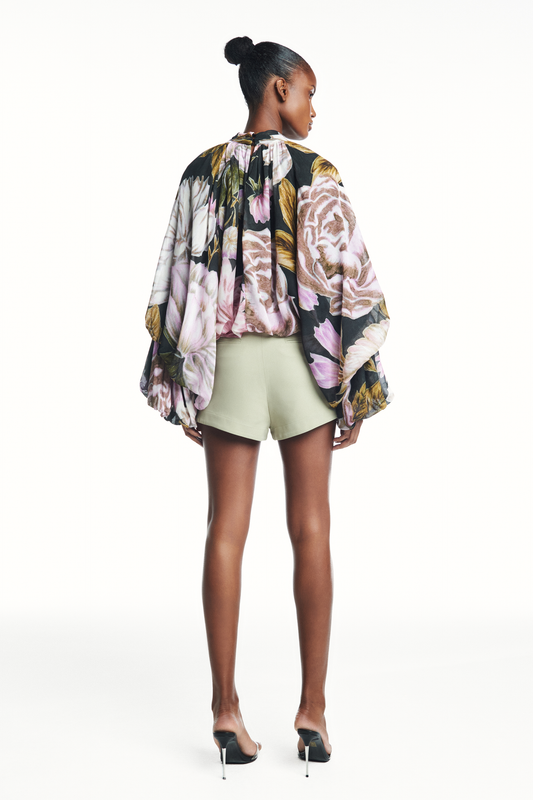 BLUSA GOLA ALTA MULLET GEORGETE FLORAL PRETO
