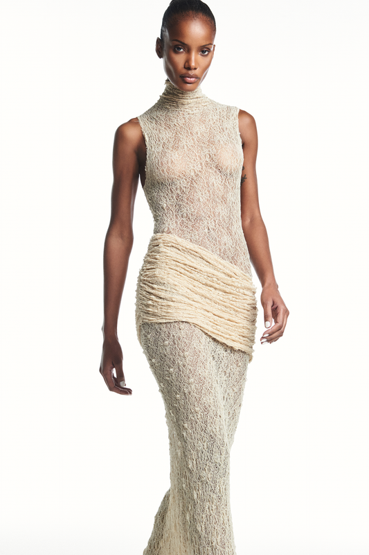 VESTIDO LONGO MANGA LONGA RECORTES RENDA BEGE
