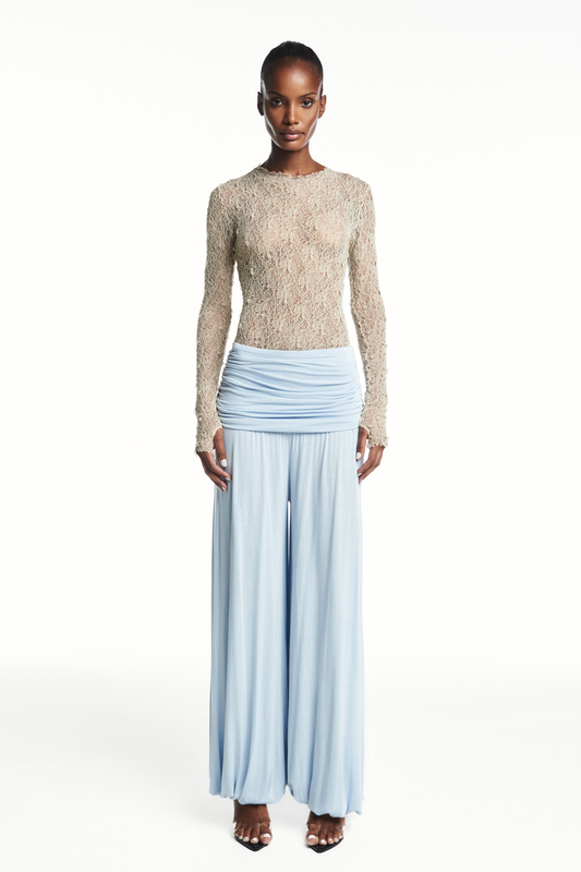 CALÇA PALA DRAPEADA ELÁSTICO BARRA MALHA AZUL
