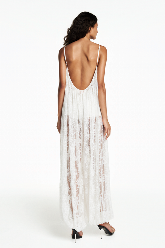 08 Dias úteisVESTIDO LONGO SEM MANGA GOLA ALTA METAIS RENDA OFF WHITE