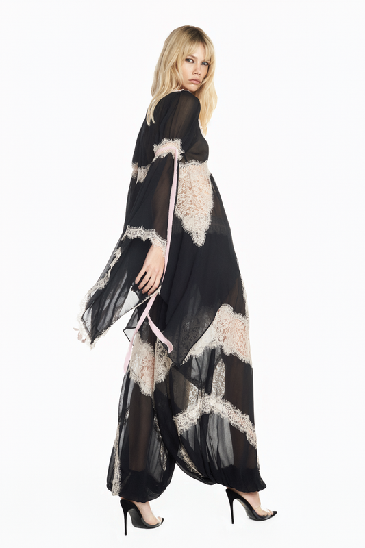 VESTIDO LONGO MANGA LONGA CHIFFON PRETO COM RENDA BEGE