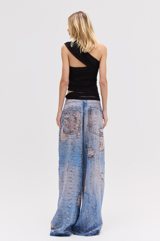 SaleCALÇA SARJA PERNA AMPLA ESTAMPA JEANS ALFINETES
