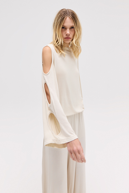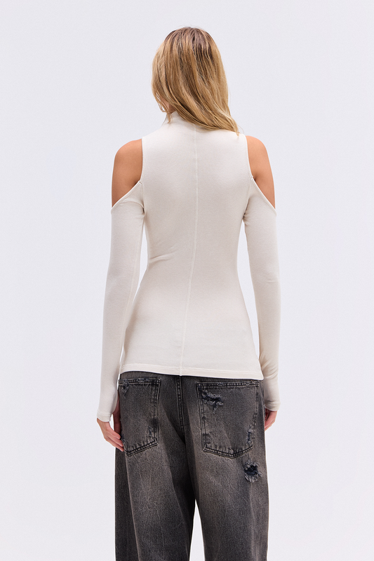BLUSA GOLA ALTA ABERTURA OMBRO MALHA BEGE