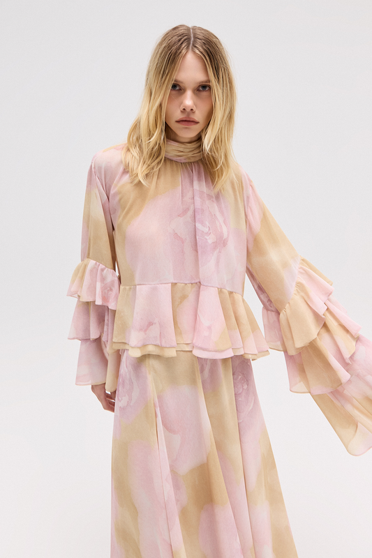 EsgotadoBLUSA GOLA ALTA BABADOS BARRA E MANGAS GGT FLORAL
