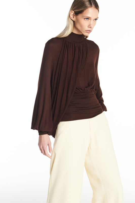 BLUSA GOLA ALTA MANGA PALA CINTURA FAIXA DRAPEADA MALHA MARROMPreço normal R$ 890,00Preço normalPreço unitário porR$ 890,00Preço promocional R$ 890,004x R$ 222,50