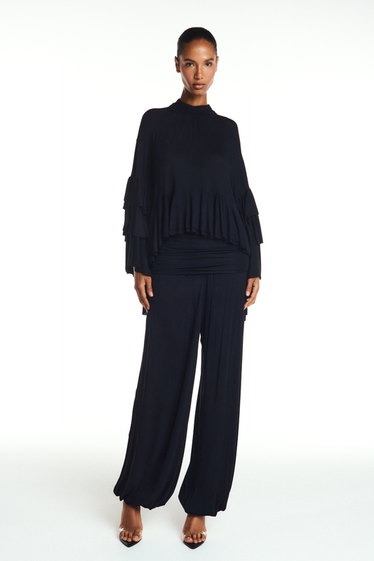 BLUSA GOLA ALTA BABADOS BARRA E MANGAS MALHA PRETAPreço normal R$ 990,00Preço normalPreço unitário porR$ 990,00Preço promocional R$ 990,004x R$ 247,50