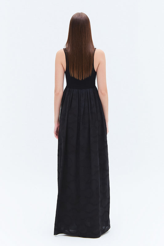 VESTIDO LONGO PEITO TRICOT CORPO JACQUARD ALGODÃO PRETO