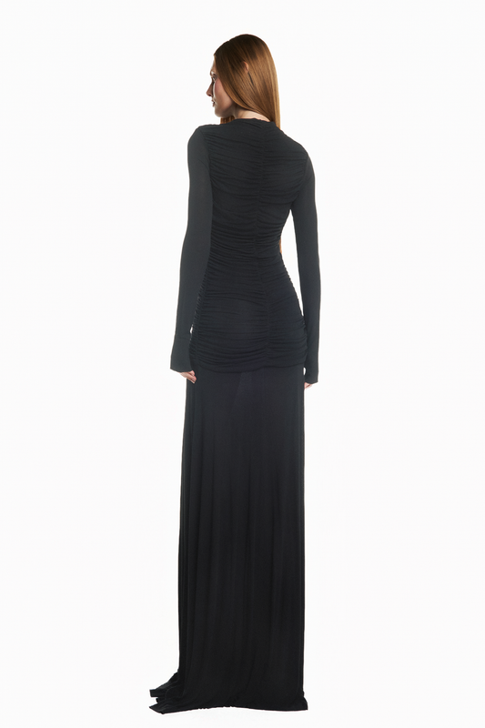 VESTIDO LONGO CORPO DRAPEADO MANGA LONGA MALHA PRETO
