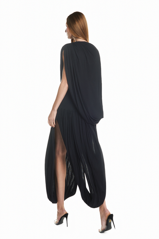VESTIDO LONGO CAPA SOBREPOSTA SAIA TORCIDA MALHA PRETO