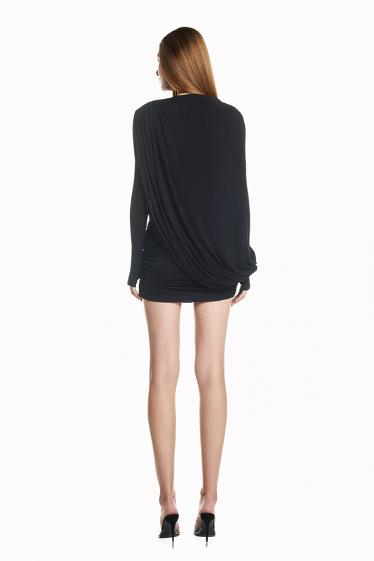 VESTIDO CURTO MANGA LONGA CORPO DRAPEADO CAPA SOBREPOSTA MALHA PRETO