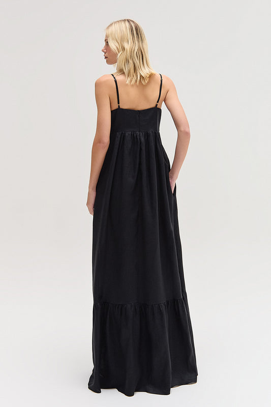 SaleVESTIDO LONGO LINHO PEITO ESTRUTURADO RECORTES PRETO