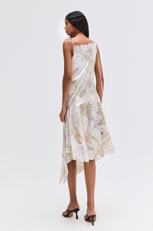 SaleVESTIDO ALÇA PONTAS ASSIMÉTRICAS CETIM E RENDA ESTAMPA FLORAL