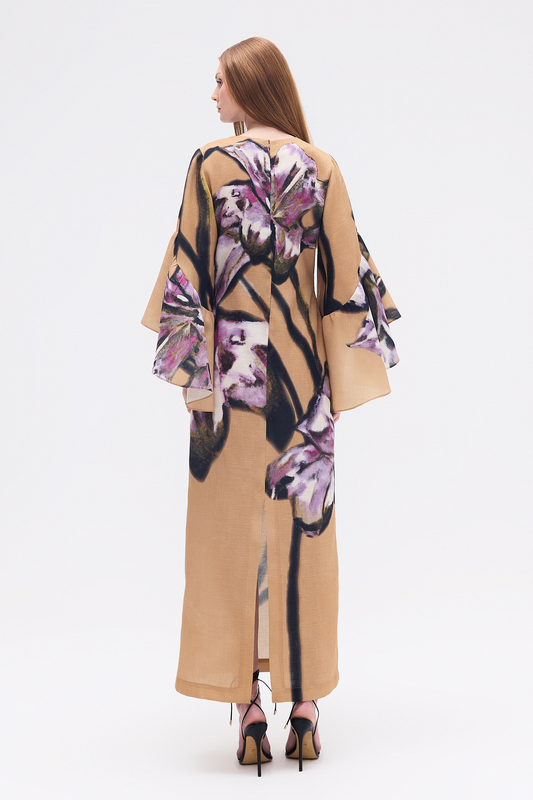 SaleVESTIDO LONGO LINHO MANGA BABADOS FLORAL