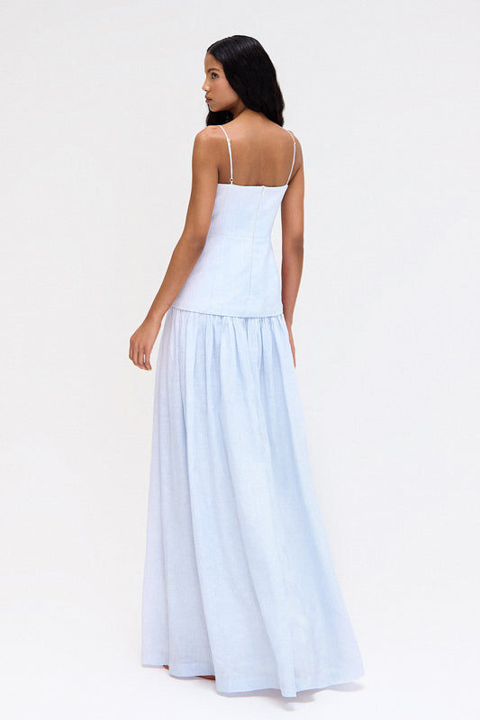 SaleVESTIDO LONGO CORPO ESTRUTURADO LINHO LISTRAS FINAS AZUL CLARO